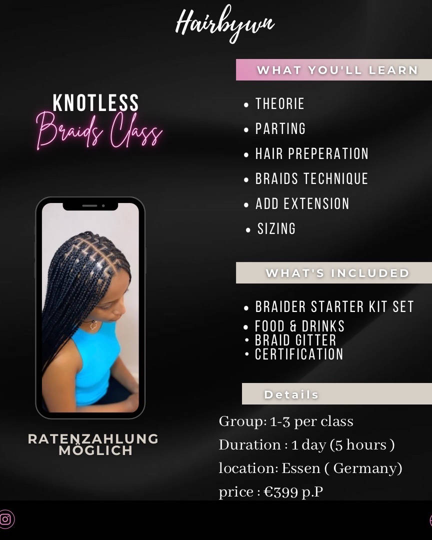 Hey ich bin die Braidedbywn und möchte dir gerne das Flechten bei bringen 💓 Dies ist ein toller Start für Eltern, Jungs und Mädels, die gerne das Flechten lernen möchten! Die Kurse sind auch perfekt für die, die ihr Handwerk verbessern möchten. Wähle zwischen Conows oder Braids, oder möchtest du vielleicht 2 Kurse an 2 Tagen abschließen? Vielleicht kannst du auch schon flechten und möchtest in den Perfektionskurs. Möchtest du wissen, wie du mit der Haarstruktur deines Kindes umgehst? Und es dir selbst erleichtern Dann melde dich jetzt an!