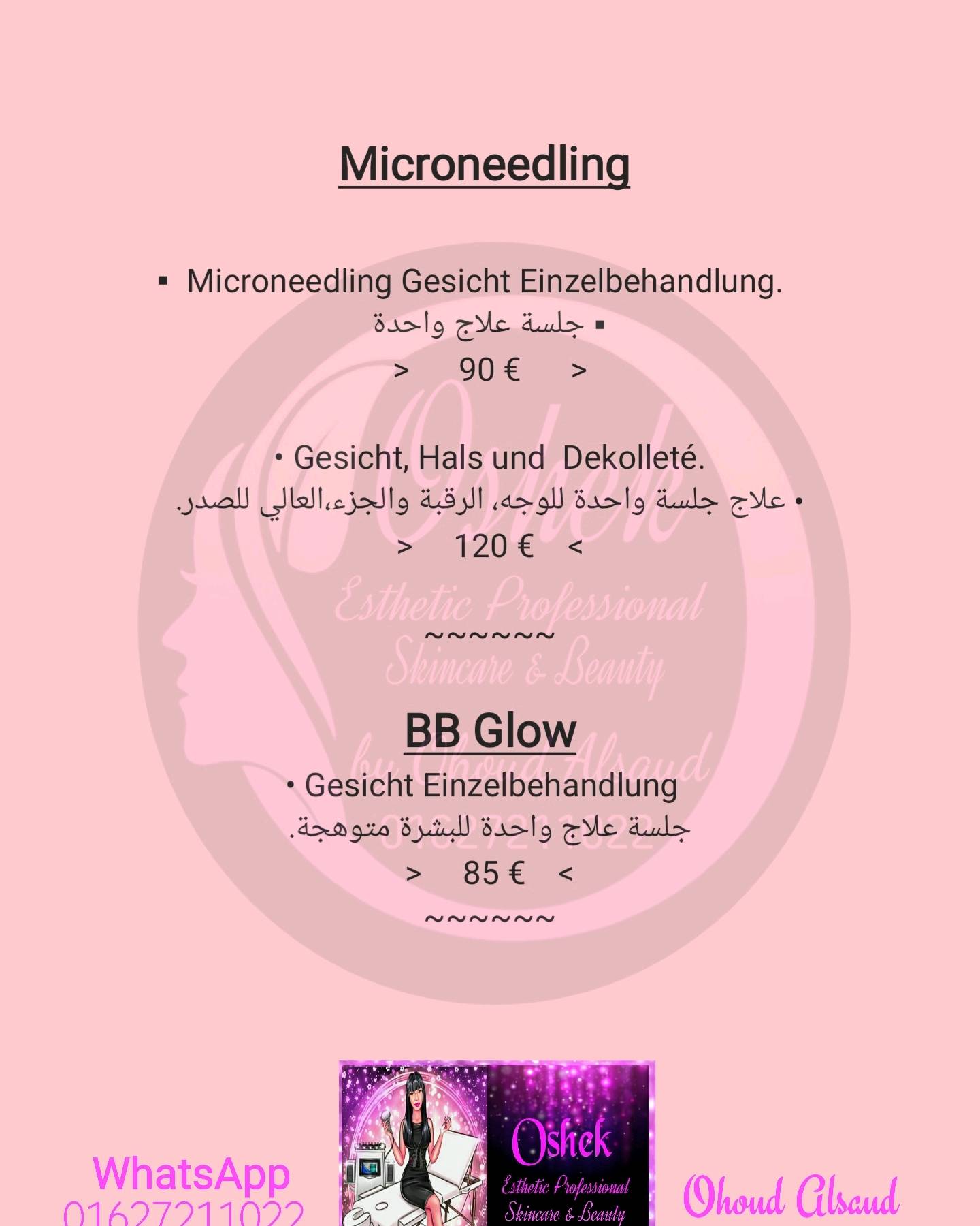 Oshek Esthetic Professional skincare Cosmetics (Haut und Körper). Hallo, ich bin Ohoud°, eine Kosmetikerin, die sich auf Haut- und Körperpflege spezialisiert hat. Eines meiner Interessen waren die modernen Technologien in der Welt der nicht-chirurgischen Hautkosmetik, Auch alle anderen traditionellen Behandlungsmethoden beherrschte ich. Dermatologische und kosmetische Gesichts-, Haut- und Körperpflege. Die Beratung ist der erste Schritt zu „neuer“ Haut. Unter Berücksichtigung Ihrer Wünsche erstelle ich Ihnen einen individuellen Behandlungsplan und die häusliche Betreuung, denn nur Ihre aktive Mitarbeit zu Hause garantiert eine nachhaltige Besserung. Meine Leidenschaft ist die Verbesserung Ihrer Haut. Dies gilt gleichermaßen für Gesicht und Körper. Sie wünschen sich innovative Kosmetikbehandlungen? Eine Kosmetik, die Hautpflege und Anti-Aging on top kombiniert eben?
