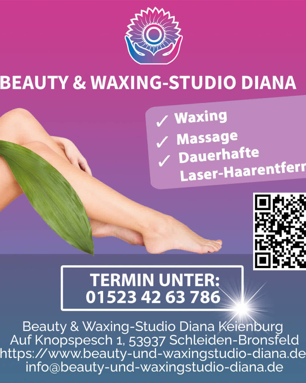 Diana in Schleiden bietet Leistungen in Kosmetik, Gesichts- & Körperbehandlungen, Kosmetik, Wimpernbehandlungen, Nails, Pediküre, Nails, Nageldesign, Haarentfernung, Waxing, Haarentfernung, Dauerhafte Haarentfernung, Körper, Massagen, Körper, Gewichts- & Cellulite Behandlungen an.